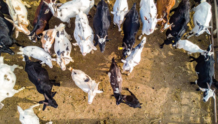 From a birds-eye perspective, a diverse herd of goats gathers in their pen, creating a dynamic pattern of black, white, and spotted coats against the earthy ground. This aerial view captures the essence of rural farm life and the organized, communal nature of livestock.