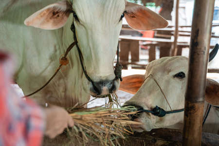 Cows are eating rice straw in a cowshed, livestock in Thailand