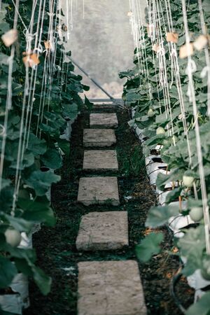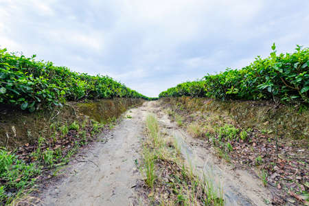 View with a shallow depth of field of a narrow pathway in between of two agricultural fields on a farm in a tropical setting fenced with black meshes with palms in a defocused background