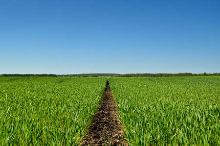 Straight road on the wheat field. Winter crops field with deep blue sky in spring.