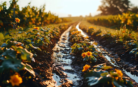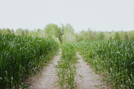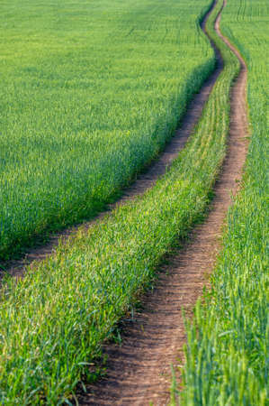 Green sprouts in the ground. road in the field. Petals of grown culture. agricultural photography.