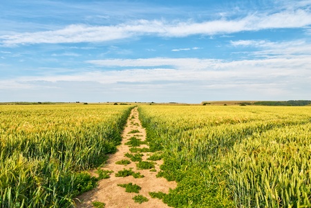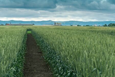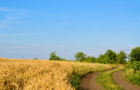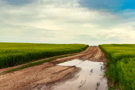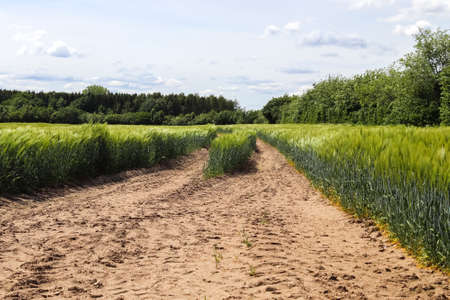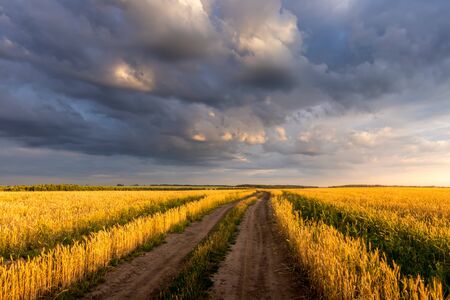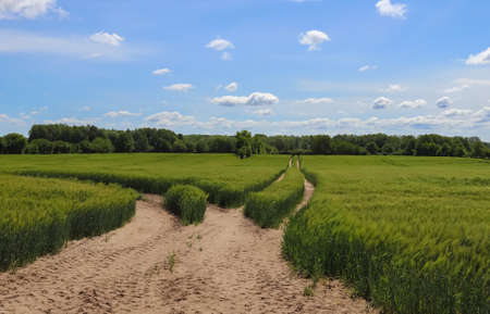Road through the field with young golden rye or wheat in the summer sunny day with a cloudy sky background. Overcast weather. Landscape.