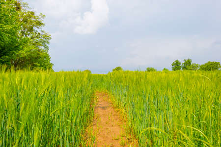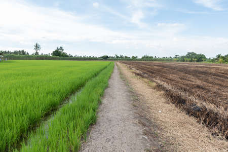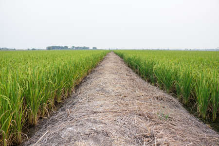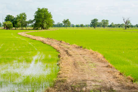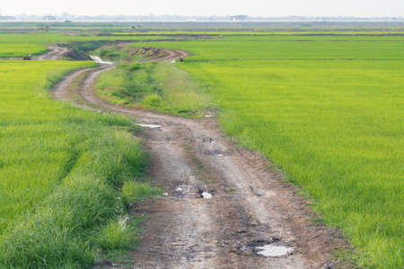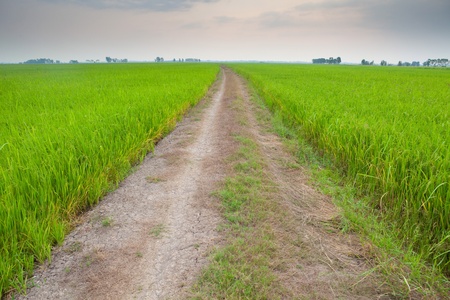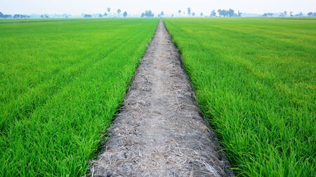 Landscape of green rice field with trail in Thailand