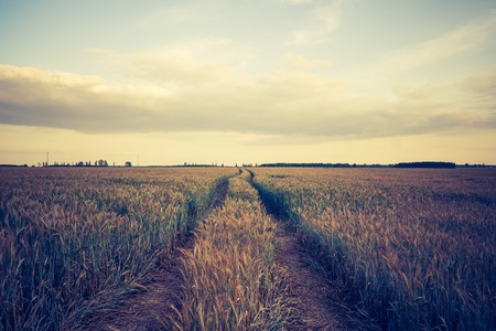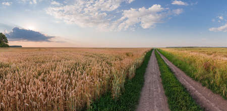 Fields of ripening wheat and barley and narrow dirt road between them against the sky at sunset, panoramic view