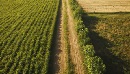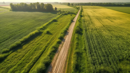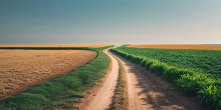 AI Generated. Rural landscape with a winding dirt road surrounded by lush green fields and crop lines under a clear sky Copy Space