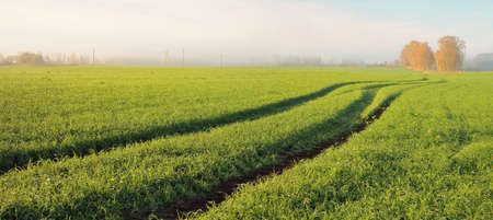 Green plowed agricultural field, tractor tracks, close-up. Picturesque panoramic landscape. Rural scene. Natural pattern, texture, background