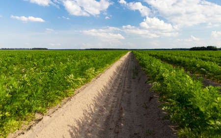 agricultural fields with furrows in which carrots are planted but have already sprouted, agriculture in Eastern Europe