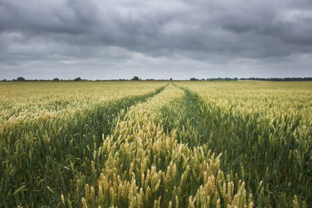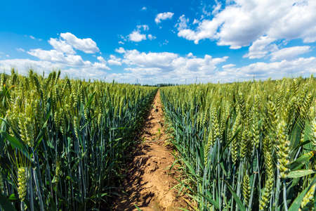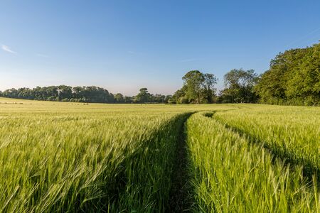 footpath through wheat field in english couty of kent on early morning late spring