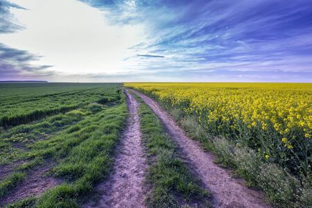 Scenic view at the country road between rapeseed and wheat fields
