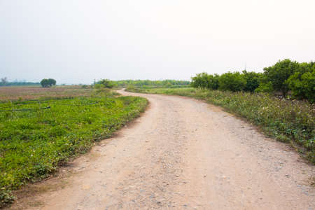 Rural dirt road and grass on both sides of the road. Path in rural fields
