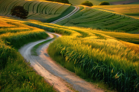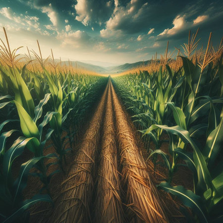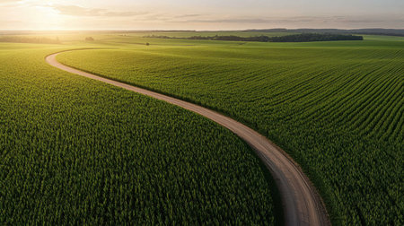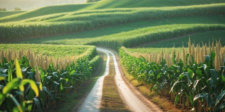 AI Generated. Winding dirt road through lush green cornfield invites peaceful exploration in a tranquil landscape setting