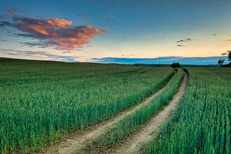 Dirt road through green fields and clouds after sunset. Nowiny, Poland
