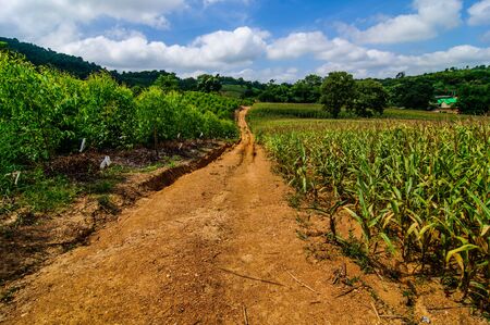 Corn farm along the road with sunset, countryside of Thailand