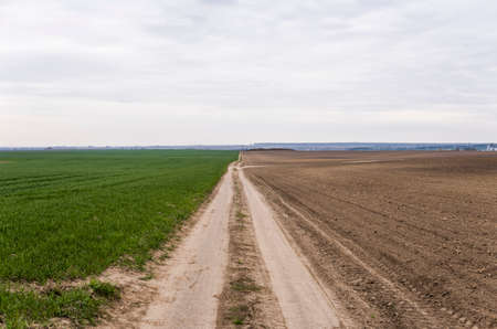 The road between the green fields of young shoots of crops. panoramic view