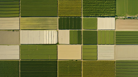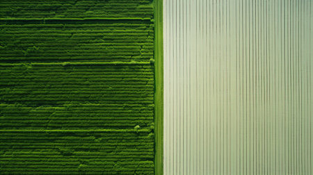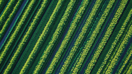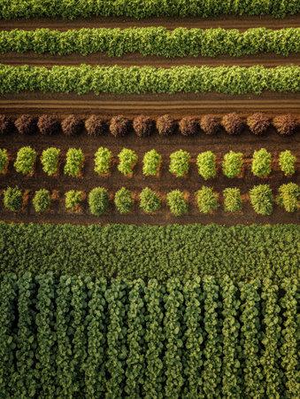 Aerial shot of organic farm with neatly planted rows of green crops, showcasing sustainable agriculture.