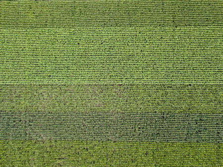 Aerial view of cabbage rows field in agricultural landscape. Cabbage field on a commercial farm. View from drone.