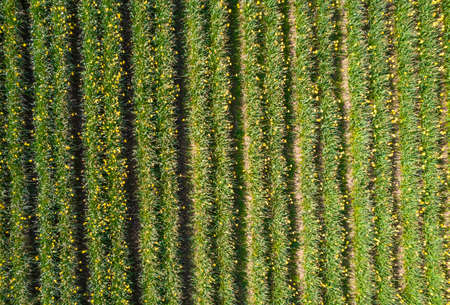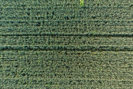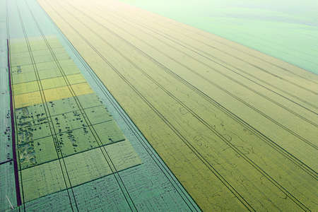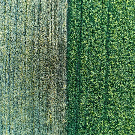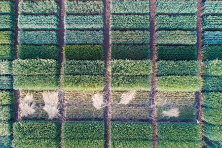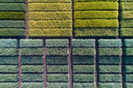 Aerial image of agricultural test plots with different sorts of cereal crops, hybrids, shoot from drone