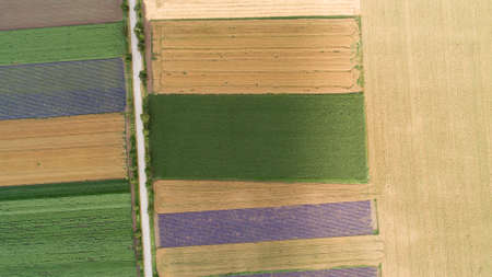 Top view of agricultural parcels with different crops in summer time shoot from drone