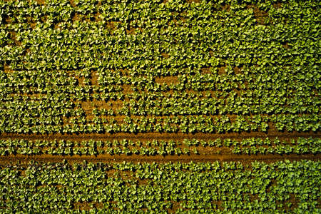 plant vegetables crop growing in the farm garden, Agricultural organic green food industry production of salad lettuce on field, top view scene from drone