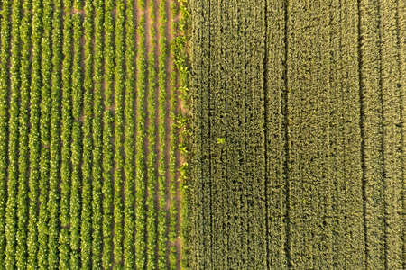 Top view of different agricultural fields. Yellow wheat field, yellow sunflower