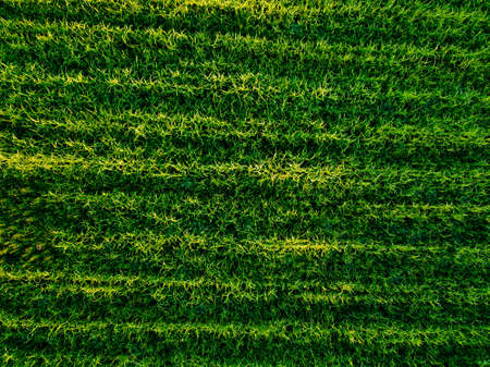 Aerial view of corn maize crop sprouts in cultivated agricultural field, drone pov. Agriculture and farming concept.