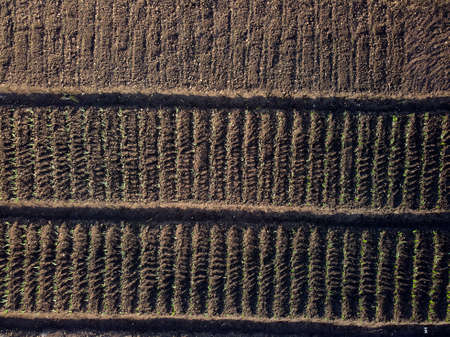 Plowed field after harvest, Top view. Sowing seeds on a plantation near the farm. Farm and agricultural concept. Agriculture and horticulture. Young plants and crops began to grow from the soil.