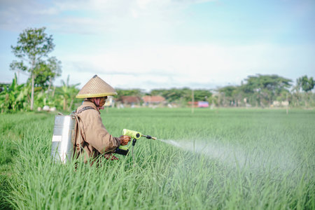 farmer spraying pesticide in the rice field