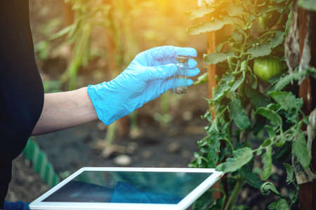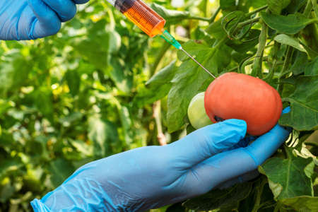 Pesticides used in food. Scientist's gloved hand sticks a syringe of liquid into tomatoes hanging on branch, close-up. Non organic vegetables. Genetically modified farming concept.