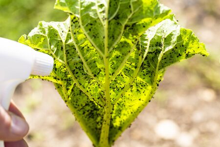 Woman hand using spray on rhubarb plant with infected by many black aphids. Using no pesticide, made with water, green soap and vinegar.