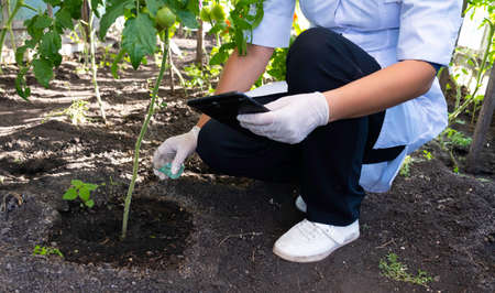 Plant disease agronomist. Junior agricultural scientists research greenhouse plants and look for a way to control pests. yellow leaf. Scientist in white coat. Diseases of agricultural plants