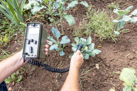 Laboratory worker testing plant sprouts before harvest in the field.