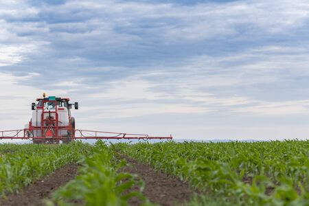 Tractor fertilizes crops corn in spring