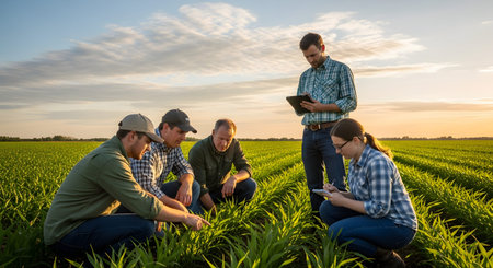 Young farmers examing planted young wheat in spring