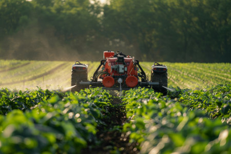 Tractor spraying pesticides at soy bean fields