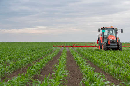 Tractor sprays liquid chemical fertilizers in corn field