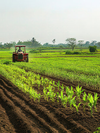Agricultural field with a tractor and corn seedlings in India