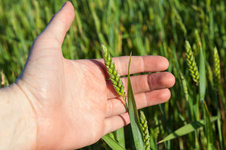 Closeup man hand holding gently wheat spikelet on sunrise. Fingers touching unripe green grain on farm field. Unrecognizable farmer checking crop quality on evening sunlight. Agriculture concept.