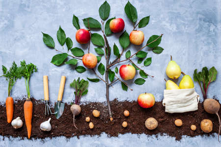 Seasonal gardening set background with various autumn natural healthy fresh fruits, vegetables, gardener tools. Farming and agriculture. Eco organic vegan food. Harvest of apple tree concept.