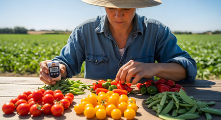 A farmer using a handheld device to scan plants and analyze their health using data from an AIpowered crop simulation model
