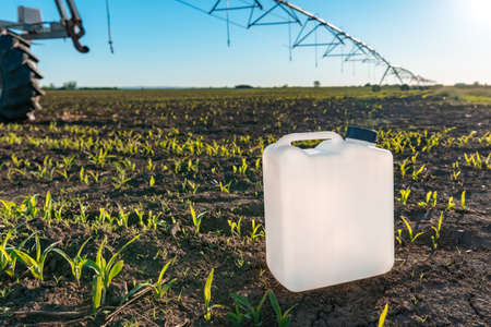 Herbicide canister can in corn field, crop protection concept