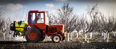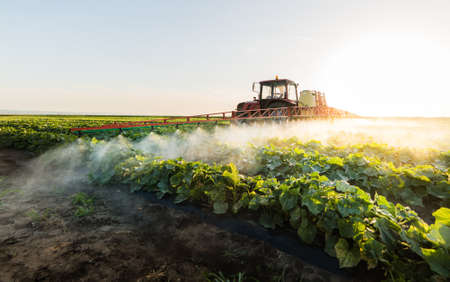 Tractor spraying pesticides on vegetable field with sprayer at spring