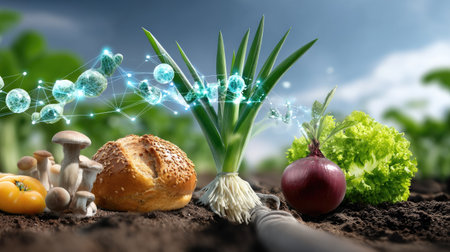 A vibrant arrangement of fresh vegetables and artisan bread set against a backdrop of organic soil, highlighting the connection between nature and technology in food cultivation.