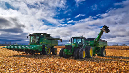 Aerial view of a combine unloads grain from grain compartment into a truck. One truck drove off and the next truck drove up to receive wheat grains.