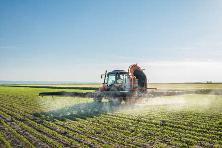 Tractor spraying pesticides on soybean field with sprayer at spring