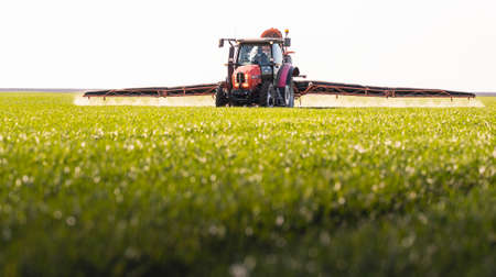 Spring agricultural work in the fields. The tractor sprays crops with herbicides, insecticides and pesticides.