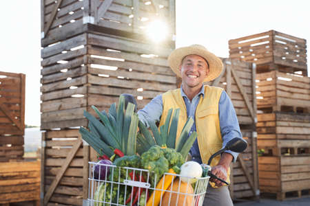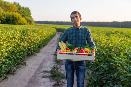 Young Asian man farmer with freshly picked vegetables in basket. Hand holding wooden box with vegetables in field. Fresh Organic Vegetables from local producers ready for transport.