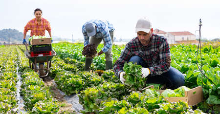 Letuce heads in wooden baskets after manual harvest on organic letuce farm. Agriculture and ecological farming concept.