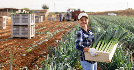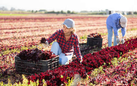 Side view portrait of two smiling workers loading harvest on cart while standing at vegetable plantation outdoors in sunlight, copy space