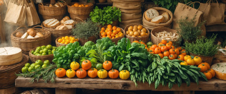 AI Generated. Natural Fresh Vegetables on Wooden Table in Traditional Market Surrounded by Organic Produce and Local Goods