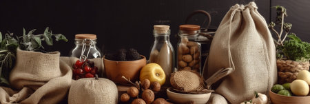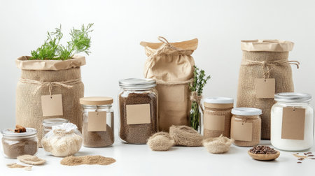 A collection of eco-friendly storage containers filled with herbs, spices, and natural ingredients, beautifully arranged for a minimalist kitchen decor.